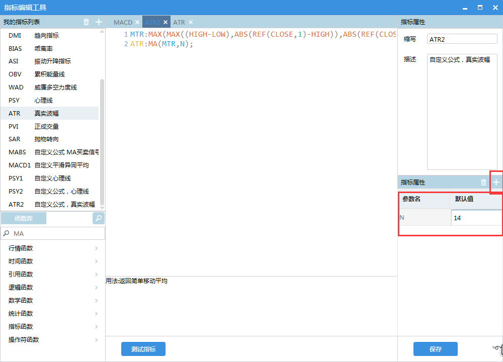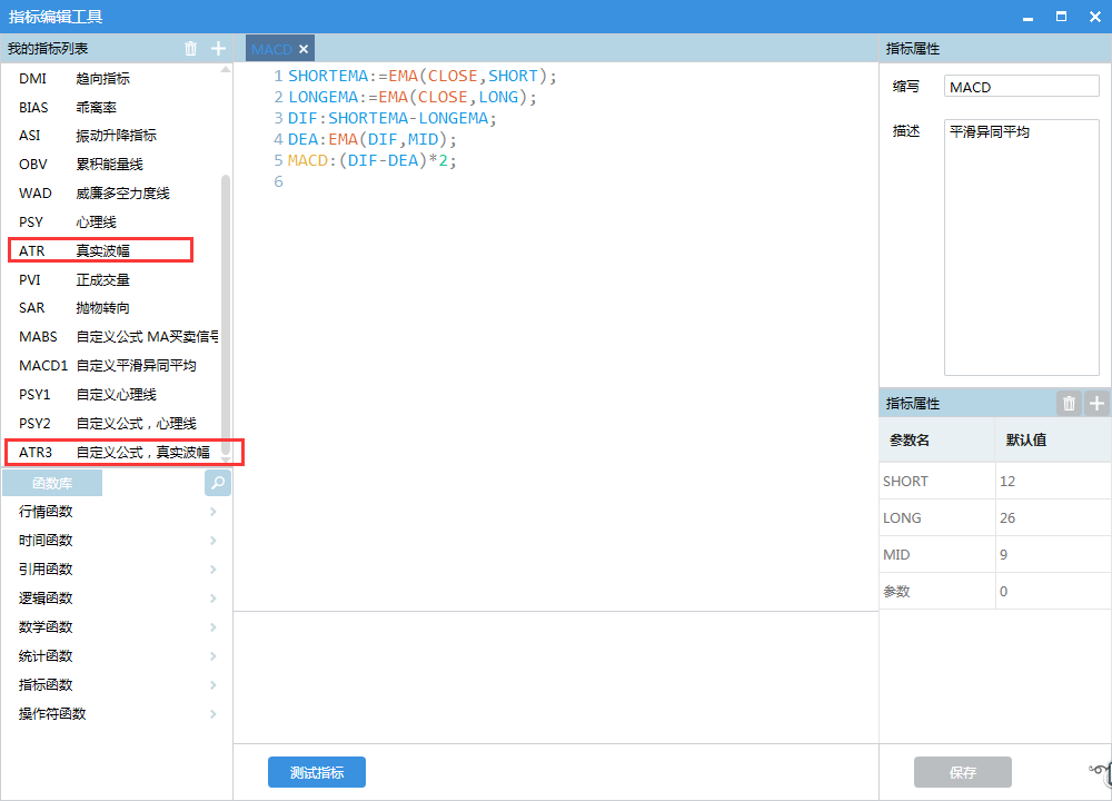 确定后,开始编写指标公式;函数库支持按函数名称搜索,双击后,添加到公式编辑区域
